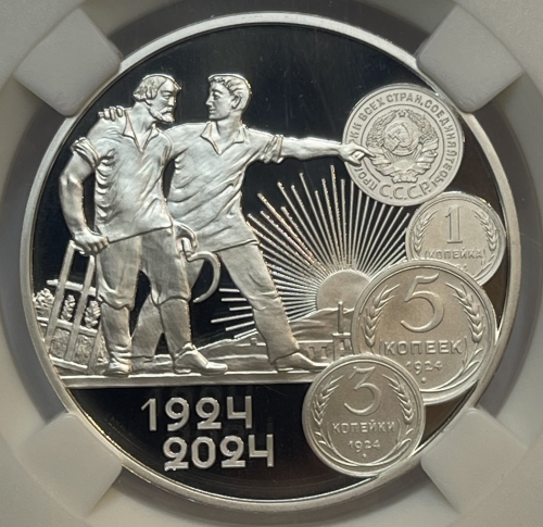 Монетовидный серебряный жетон Рубль 2024г., К 100-летию монетной системы СССР, ТИРАЖ 100 шт., в слабе ННР PROOF 70