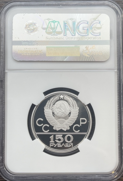 Сверху герб СССР с 15 витками ленты, слева от него буквы «СС», справа «СР», ниже двойная черта, под ней обозначение достоинства монеты цифра «150» и ниже слово «РУБЛЕЙ».