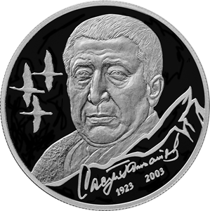 рельефные изображения портрета Р.Г. Гамзатова и летящих журавлей, а также факсимиле подписи поэта и годы его жизни «1923» и «2003», вписанные в стилизованный контур горной вершины.