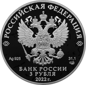 на зеркальном поле диска — рельефное изображение Государственного герба Российской Федерации, над ним вдоль канта — надпись полукругом: «РОССИЙСКАЯ ФЕДЕРАЦИЯ», обрамленная с обеих сторон сдвоенными ромбами, внизу под гербом: слева — обозначения драгоценного металла и пробы сплава, справа — содержание химически чистого металла и товарный знак монетного двора, внизу в центре в три строки — надпись: «БАНК РОССИИ», номинал монеты: «3 РУБЛЯ», год выпуска: «2022 г.».
