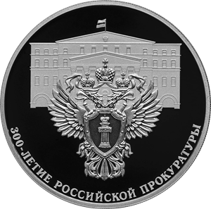 Серебряная монета 3 рубля "300-летие Российской прокуратуры" 2022г., 31,1 г. 925 проба, ПРУФ