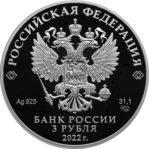 рельефное изображение Государственного герба Российской Федерации, над ним вдоль канта — надпись полукругом: «РОССИЙСКАЯ ФЕДЕРАЦИЯ», обрамленная с обеих сторон сдвоенными ромбами, под гербом: слева — обозначения драгоценного металла и пробы сплава, справа — содержание химически чистого металла и товарный знак монетного двора, внизу в центре в три строки — надпись: «БАНК РОССИИ», номинал монеты: «3 РУБЛЯ», год выпуска: «2022 г.».