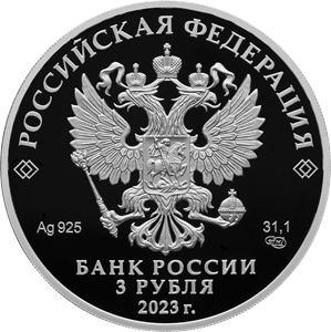 рельефное изображение Государственного герба Российской Федерации, над ним вдоль канта – надпись полукругом: «РОССИЙСКАЯ ФЕДЕРАЦИЯ», обрамленная с обеих сторон сдвоенными ромбами, под гербом: слева – обозначения драгоценного металла и пробы сплава, справа – содержание химически чистого металла и товарный знак монетного двора, внизу в центре в три строки – надпись: «БАНК РОССИИ», номинал монеты: «3 РУБЛЯ», год выпуска: «2023 г.».