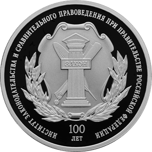 рельефное изображение эмблемы Института законодательства и сравнительного правоведения; рельефные надписи: по окружности – «ИНСТИТУТ ЗАКОНОДАТЕЛЬСТВА И СРАВНИТЕЛЬНОГО ПРАВОВЕДЕНИЯ ПРИ ПРАВИТЕЛЬСТВЕ РОССИЙСКОЙ ФЕДЕРАЦИИ», внизу в две строки – «100 ЛЕТ».