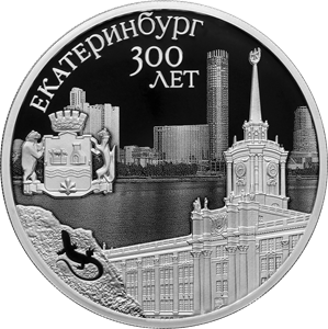 рельефные изображения здания администрации и герба Екатеринбурга, а также камня с ящеркой на фоне выполненной в технике лазерного матирования панорамы города; вверху – рельефные надписи: слева по окружности – «ЕКАТЕРИНБУРГ», под ней в две строки – «300 ЛЕТ».