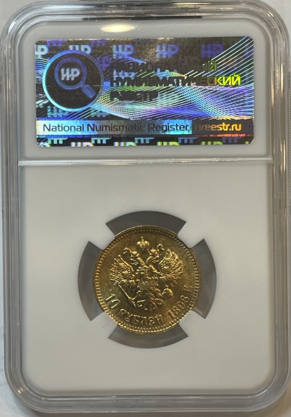 В центре изображен Малый Государственный Герб Российской империи - двуглавый орёл, головы которого увенчаны двумя коронами, третья, большая корона над ними. Все они соединены орденской лентой ордена Св. Апостола Андрея Первозванного. На груди орла расположен Московский герб, в щите изображен Георгий Победоносец с копьем поражающий дракона. Вокруг щита цепь ордена Св. Апостола Андрея Первозванного. На крыльях изображены гербы: Царства Казанского, Польского, Херсонеса Таврического, Астраханского, Сибирского, Грузинского, герб соединенных княжеств Киевского, Новгородского и Владимирского и герб Великого Княжества Финляндского — по 4 на каждое крыло. В правой лапе орла – скипетр, в левой – держава. Под ним слева направо изображены: номинал - надпись «10 РУБЛЕЙ» и дата выпуска «1898 Г.». По окружности канта имеются рельефные элементы, выполненные в виде зубцов.