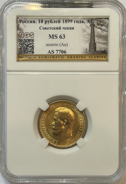 Вы всегда можете купить или продать, а также узнать текущую стоимость монеты - 'Золотая монета 10 рублей Николай II 1899г., в слабе NGS MS 63' в г.Смоленск (Смоленская область). У нас Вы получите полную и необходимую консультация от квалифицированных специалистов и профессионалов, работающих на рынке инвестиций в драгметаллы уже долгое время. Мы стараемся предложить нашим клиентам лучшие цены выкупа и продажи на рынке (с минимальным спредом), а также гарантируем конфиденциальность всех проводимых сделок.