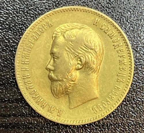 В центре изображен Малый Государственный Герб Российской империи - двуглавый орёл, головы которого увенчаны двумя коронами, третья, большая корона над ними. Все они соединены орденской лентой ордена Св. апостола Андрея Первозванного. На груди орла расположен Московский герб - щит с изображением Георгия Победоносца с копьём поражающего дракона. Вокруг щита цепь ордена Св. апостола Андрея Первозванного. На крыльях изображены гербы: Царства Казанского, Польского, Херсонеса Таврического, Астраханского, Сибирского, Грузинского и герб соединенных княжеств Киевского, Новгородского и Владимирского — по 4 на каждое крыло. В правой лапе орла – скипетр, в левой – держава. Под ним слева направо изображены: номинал - надпись «10 РУБЛЕЙ» и дата выпуска «1902 Г.». По окружности канта имеются рельефные элементы, выполненные в виде зубцов.