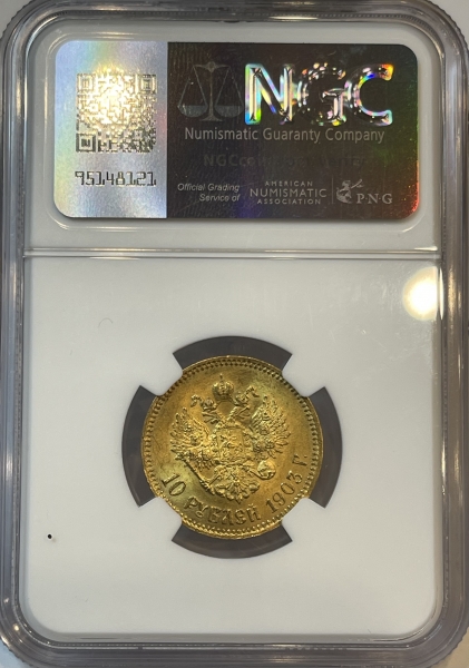 В центре изображен Малый Государственный Герб Российской империи - двуглавый орёл, головы которого увенчаны двумя коронами, третья, большая корона над ними. Все они соединены орденской лентой ордена Св. апостола Андрея Первозванного. На груди орла расположен Московский герб - щит с изображением Георгия Победоносца с копьём поражающего дракона. Вокруг щита цепь ордена Св. апостола Андрея Первозванного. На крыльях изображены гербы: Царства Казанского, Польского, Херсонеса Таврического, Астраханского, Сибирского, Грузинского и герб соединенных княжеств Киевского, Новгородского и Владимирского — по 4 на каждое крыло. В правой лапе орла – скипетр, в левой – держава. Под ним слева направо изображены: номинал - надпись «10 РУБЛЕЙ» и дата выпуска «1903 Г.». По окружности канта имеются рельефные элементы, выполненные в виде зубцов.