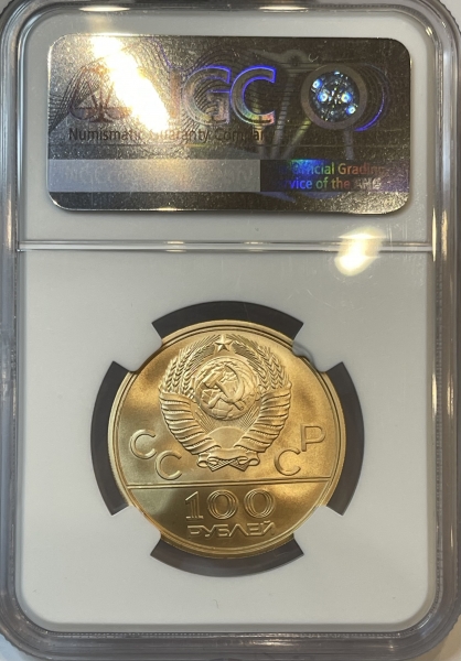 Золотая монета 100 рублей "Спортивный зал Дружба" Олимпиада 80, 1979г., в слабе NGC MS 68
