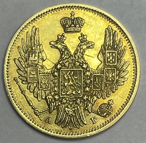 В центре указан номинал «5», ограниченный с обеих сторон пятиконечными цветочными розетками. Под цифрой номинала — слово "РУБЛЕЙ". Ниже, расположен декоративный разделитель в виде двух разнонаправленных фигурных линий и небольшой выпуклой восьмиконечной звезды между ними. Под разделителем — дата выпуска монеты «1849». Под цифрой даты — обозначение монетного двора «С.П.Б.». Центральная часть отделена от остального изображения, окружностью в виде точек. За окружностью круговая надпись: «ЧИСТОГО ЗОЛОТА 1 ЗОЛОТНИК 39 ДОЛЕЙ», разделенная сверху цветочной розеткой. По окружности канта имеются рельефные элементы, выполненные в виде зубцов.