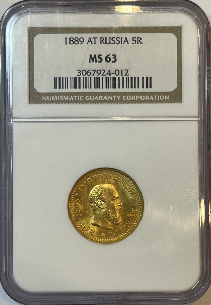 В центре изображен Малый Государственный Герб Российской империи - двуглавый орёл, головы которого увенчаны двумя коронами, третья, большая корона над ними. Все они соединены орденской лентой ордена Св. апостола Андрея Первозванного. На груди орла расположен Московский герб - щит с изображением Георгия Победоносца с копьём поражающего дракона. Вокруг щита цепь ордена Св. апостола Андрея Первозванного. На крыльях изображены гербы: Царства Казанского, Польского, Херсонеса Таврического, Астраханского, Сибирского, Грузинского и герб соединенных княжеств Киевского, Новгородского и Владимирского — по 4 на каждое крыло. В правой лапе орла – скипетр, в левой – держава. Под ним слева направо изображены: номинал - надпись «5 РУБЛЕЙ» и дата выпуска «1889 Г.». По окружности канта имеются рельефные элементы, выполненные в виде зубцов.