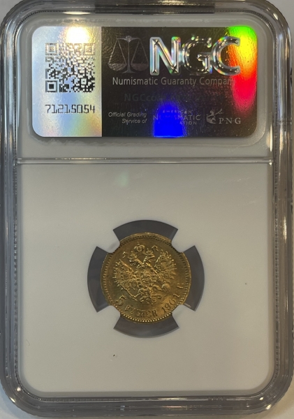 В центре изображен Малый Государственный Герб Российской империи - двуглавый орёл, головы которого увенчаны двумя коронами, третья, большая корона над ними. Все они соединены орденской лентой ордена Св. Апостола Андрея Первозванного. На груди орла расположен Московский герб, в щите изображен Георгий Победоносец с копьем поражающий дракона. Вокруг щита цепь ордена Св. Апостола Андрея Первозванного. На крыльях изображены гербы: Царства Казанского, Польского, Херсонеса Таврического, Астраханского, Сибирского, Грузинского и герб соединенных княжеств Киевского, Новгородского и Владимирского — по 4 на каждое крыло. В правой лапе орла – скипетр, в левой – держава. Под ним слева направо изображены: номинал - надпись «5 РУБЛЕЙ» и дата выпуска «1901 Г.». По окружности канта имеются рельефные элементы, выполненные в виде зубцов.
