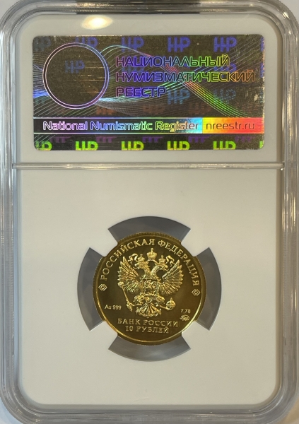 в центре – рельефное изображение Государственного герба Российской Федерации, над ним вдоль канта – надпись полукругом: «РОССИЙСКАЯ ФЕДЕРАЦИЯ», обрамленная с обеих сторон сдвоенными ромбами, внизу под гербом: слева – обозначения драгоценного металла и пробы, справа – содержание химически чистого металла и товарный знак монетного двора, внизу в центре в две строки – надпись: «БАНК РОССИИ», номинал монеты: «10 РУБЛЕЙ».