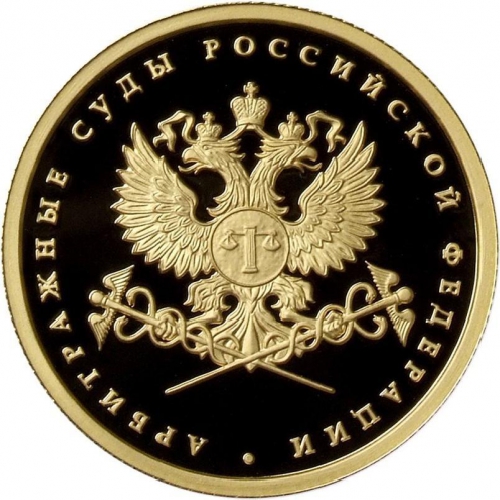 в центре диска на зеркальном поле - эмблема Высшего арбитражного суда Российской Федерации, вдоль канта - круговая надпись: "АРБИТРАЖНЫЕ СУДЫ РОССИЙСКОЙ ФЕДЕРАЦИИ".