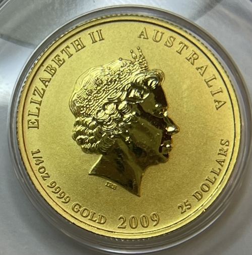 На аверсе изображен профиль королевы Елизаветы II. Сверху надпись ELIZABETH II - Елизавета ІІ и AUSTRALIA - Австралия. Внизу по ободу вес монеты (1/4 oz - четверть тройской унции), проба (999 gold), год выпуска (2009) и номинал (25  DOLLARS - 25 долларов).