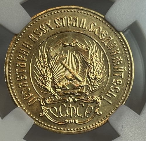 Герб РСФСР, окруженный венком из колосьев, и щит с изображением на нем серпа и молота на фоне солнечных лучей; по краю монеты точки вдоль них надписи: сверху - «ПРОЛЕТАРИИ ВСЕХ СТРАН, СОЕДИНЯЙТЕСЬ!», внизу под гербом - «Р. С. Ф. С. Р.».