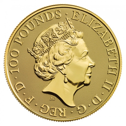 На аверсе изображен портрет королевы Елизаветы II на узорчатом фоне. По ободу помещены следующие надписи: «ELIZABETH II D G REG F D 100 POUNDS» (Елизавета II Милостью Божьей Королева, Защитница Веры; номинал – 100 фунтов стерлингов).